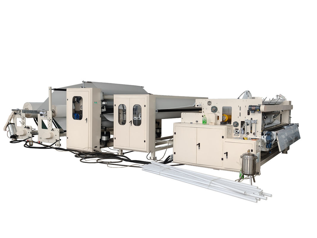 The Automatic Toilet Paper Rewinding Machine is a state-of-the-art solution designed for the efficient processing of toilet paper rolls. This advanced machine features a versatile core feeding unit, capable of handling both core-less and traditional paper rolls. The raw material is fed directly from a jumbo roll, which then undergoes color printing, perforation, end cutting, and tail glue spraying, culminating in the formation of a log roll. This log roll is further processed through a cutting machine and packing machine, resulting in the production of finished, small toilet paper rolls.